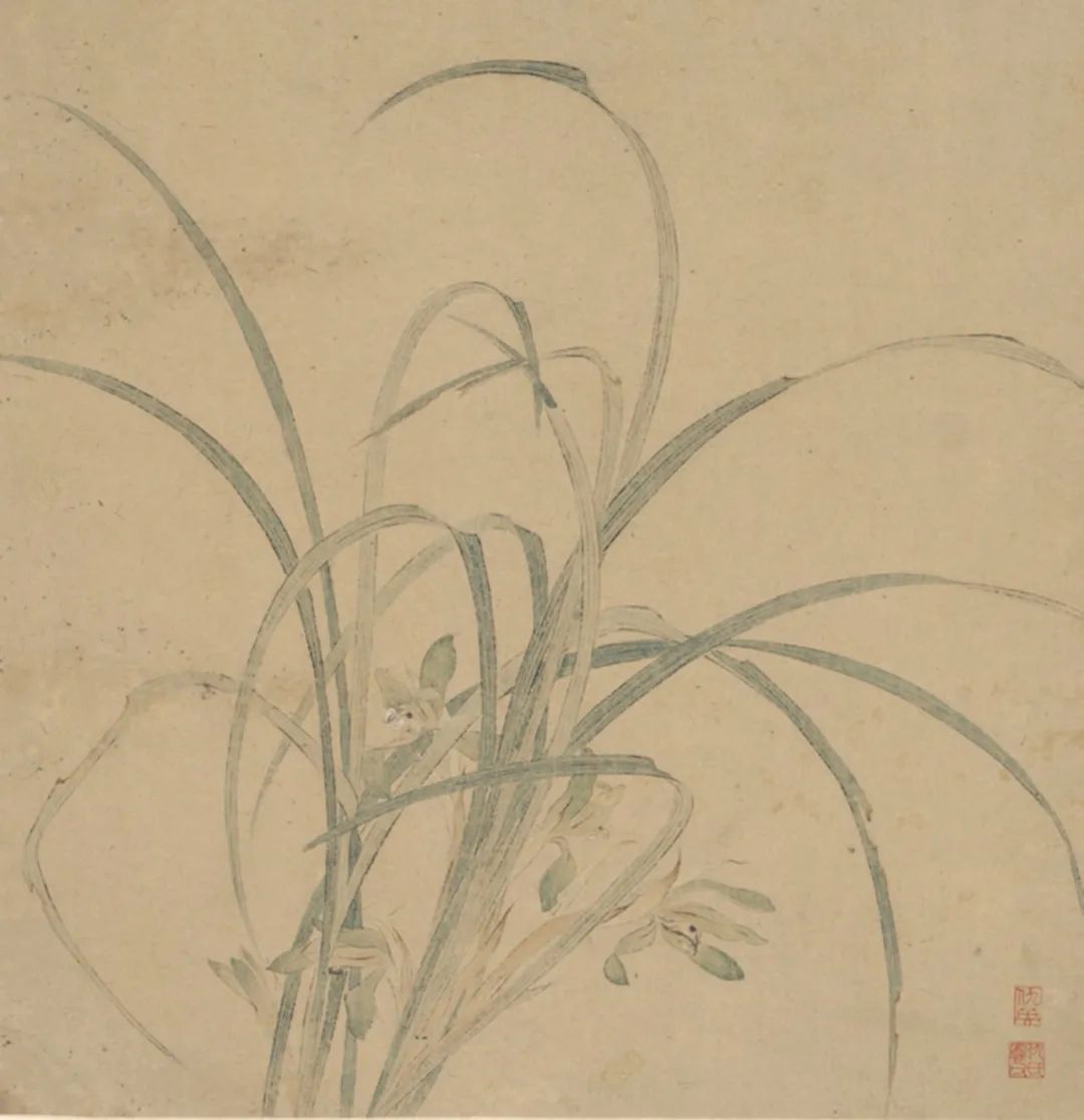 仇英的《兰花图》页,以细劲流畅的线条勾勒花叶轮廓,清淡的汁绿色晕染叶之向背,叶片上的虫蠹伤残处亦表现得很细腻,生动逼真。这幅画作既体现了职业绘画的精工细腻,又不失文人画的清雅秀逸,展现了兰花在春天中的高洁与雅致。