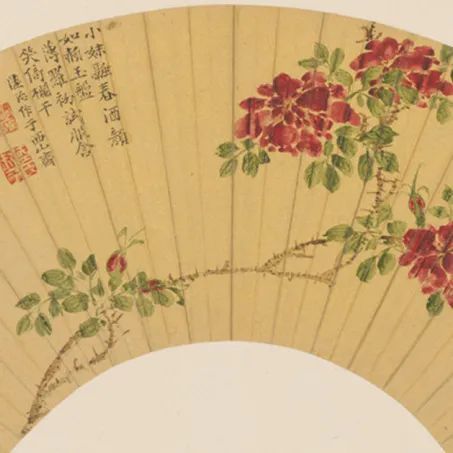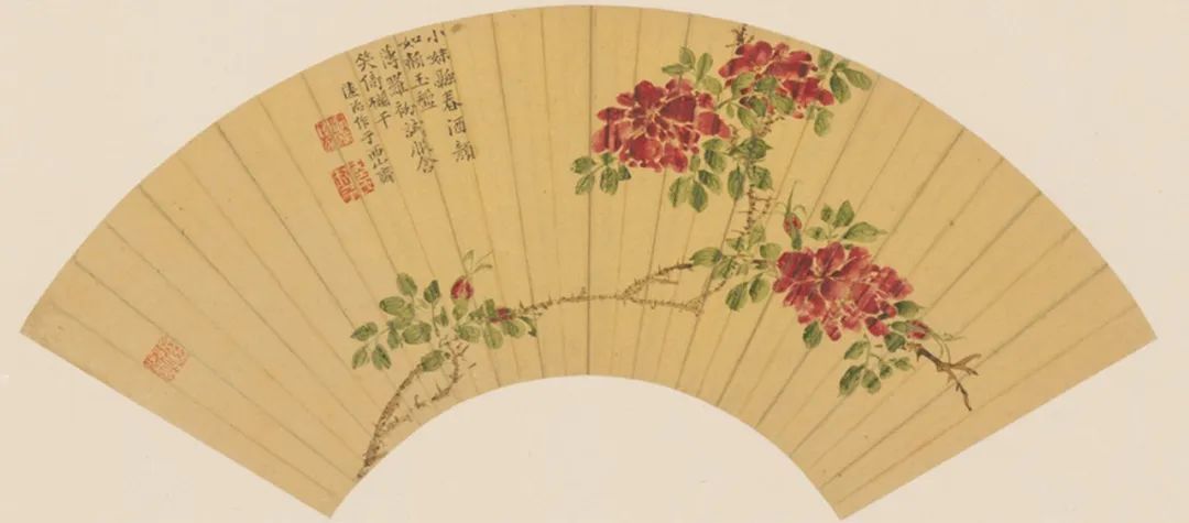 陆治(文徵明弟子)的《蔷薇图》扇页,以水墨淡设色绘一枝蔷薇花斜伸而上,构图简洁,墨色清逸而又造型精工。图中长满刺的花枝、舒展的叶片、层层绽开的花瓣都被表现得生动逼真。诗人般的自题诗句:“小妹融春酒,颜如赪玉盘。薄罗初试服,含笑倚栏干。”更是将蔷薇花比作微醺的邻家小妹,增添了画面的诗意和春意。