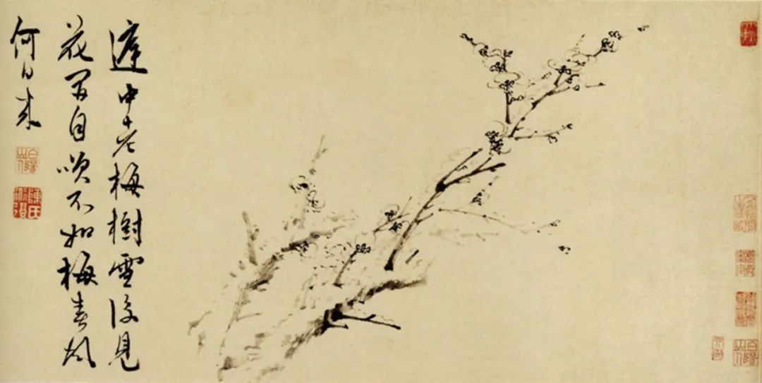 陈道复(文徵明弟子)在《红梨诗画图》卷中,根据北宋欧阳修《千叶红梨花》诗绘图并自书诗。此图与欧阳修诗高度对应,如图绘倒垂红梨花枝而非折枝,以对应诗中“徘徊绕树不忍折”;以水墨淡设色而非工笔重彩来描绘,以对应诗中的“夷陵寂寞千山里”(花开于今湖北宜昌东南的夷陵山野);突出野逸的文人趣味和怡然自得的心境,以对应“从来奇物产天涯,安得移根植帝家”等。这种诗画结合的方式,使画作更具文化内涵和艺术感染力。