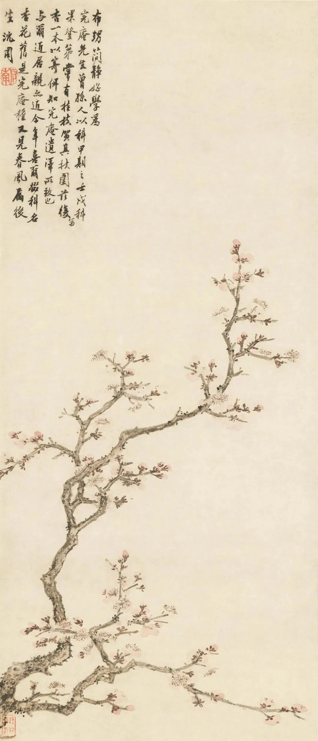 沈周的《杏花图》轴,绘杏花之一枝,杏枝或偃蹇而上,或斜枝旁生,充满了蓬勃向上的朝气。树枝以墨笔写就,内有短笔皴点表示其质感,杏花则以淡胭脂色染,墨笔勾蕊点萼,整幅画作充满了春天的气息。